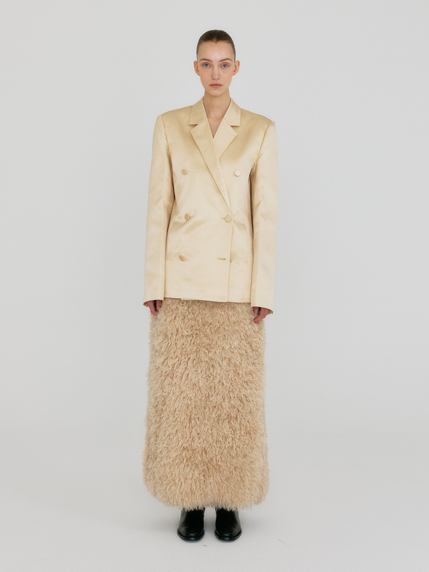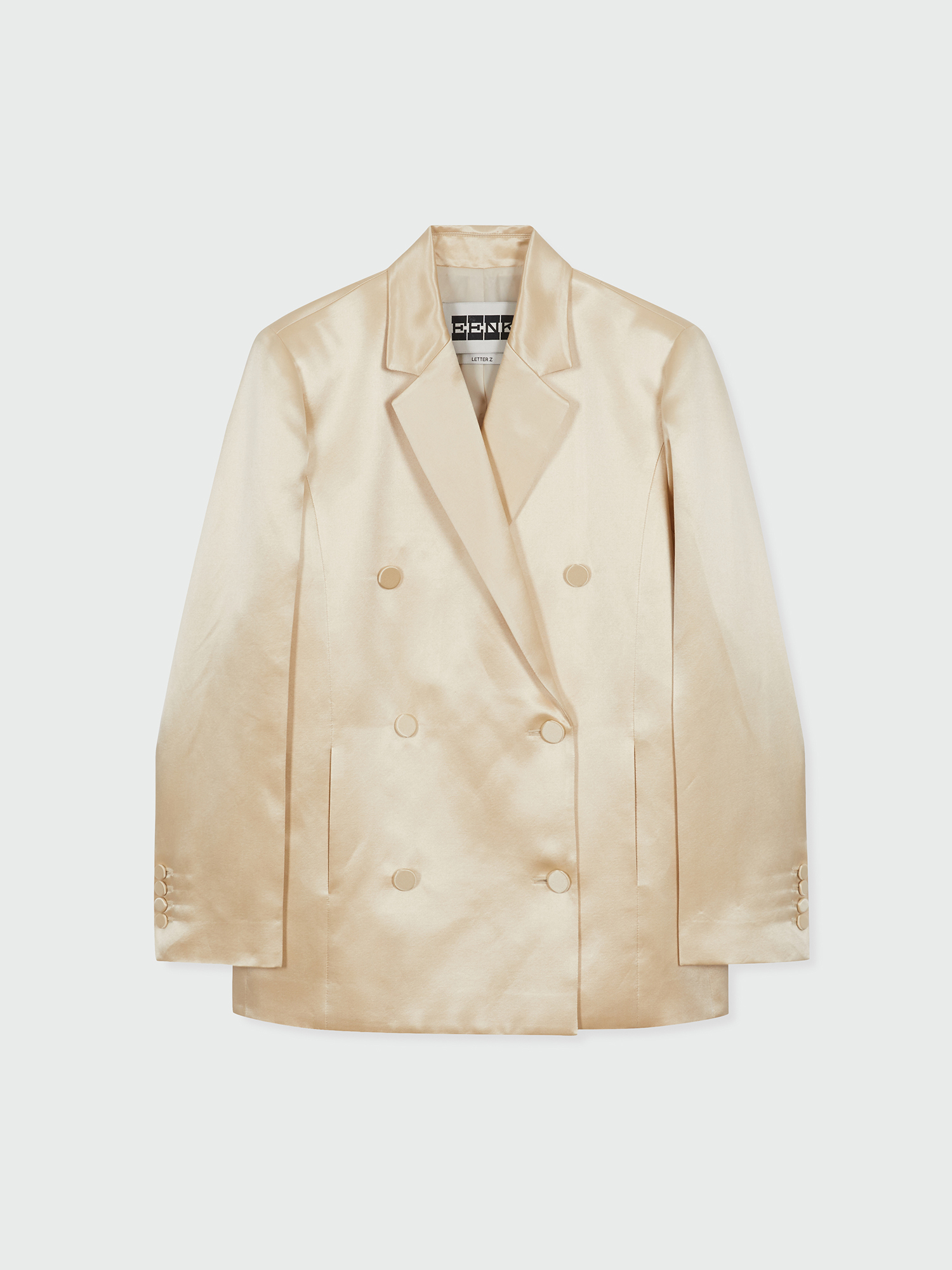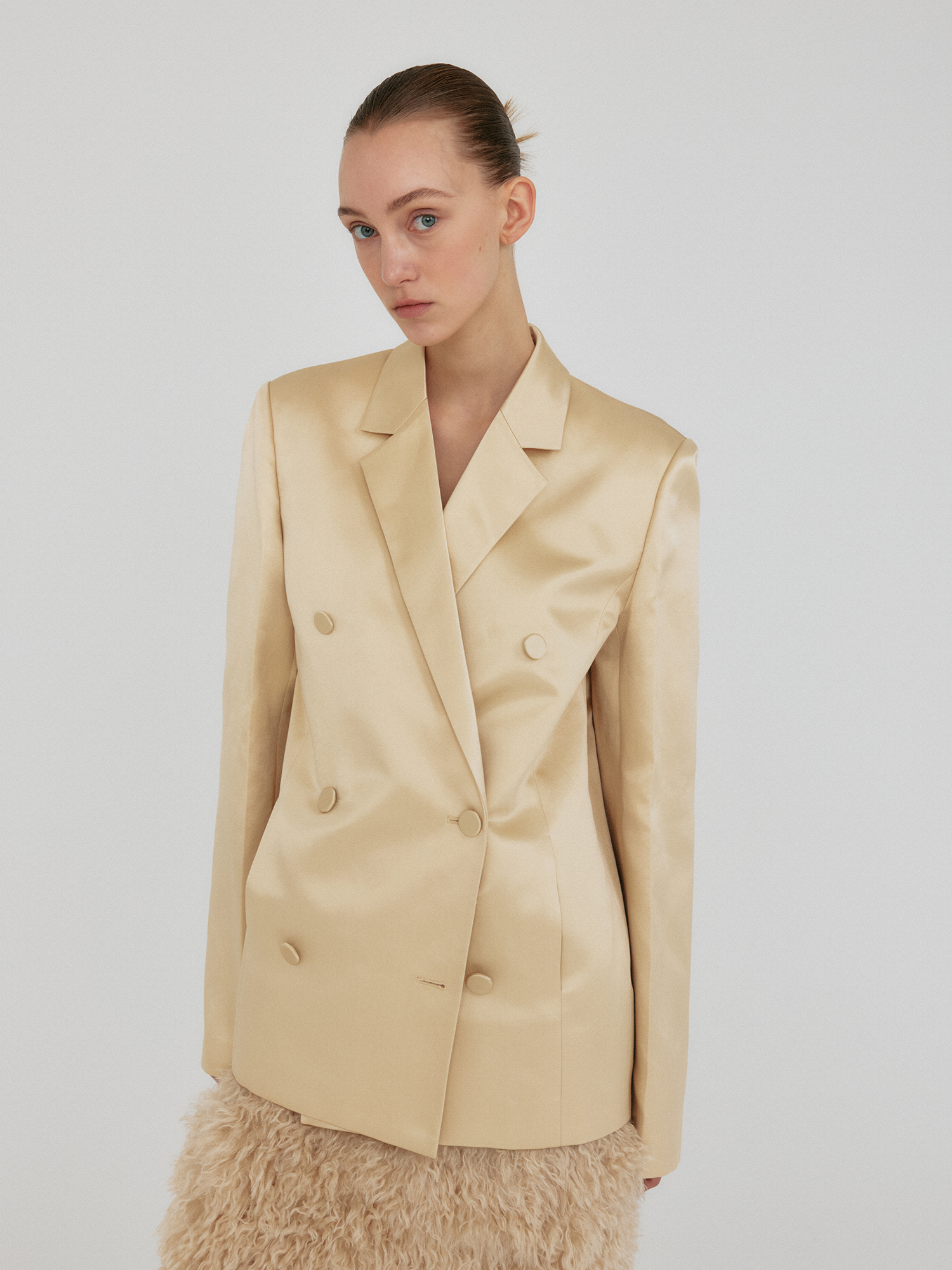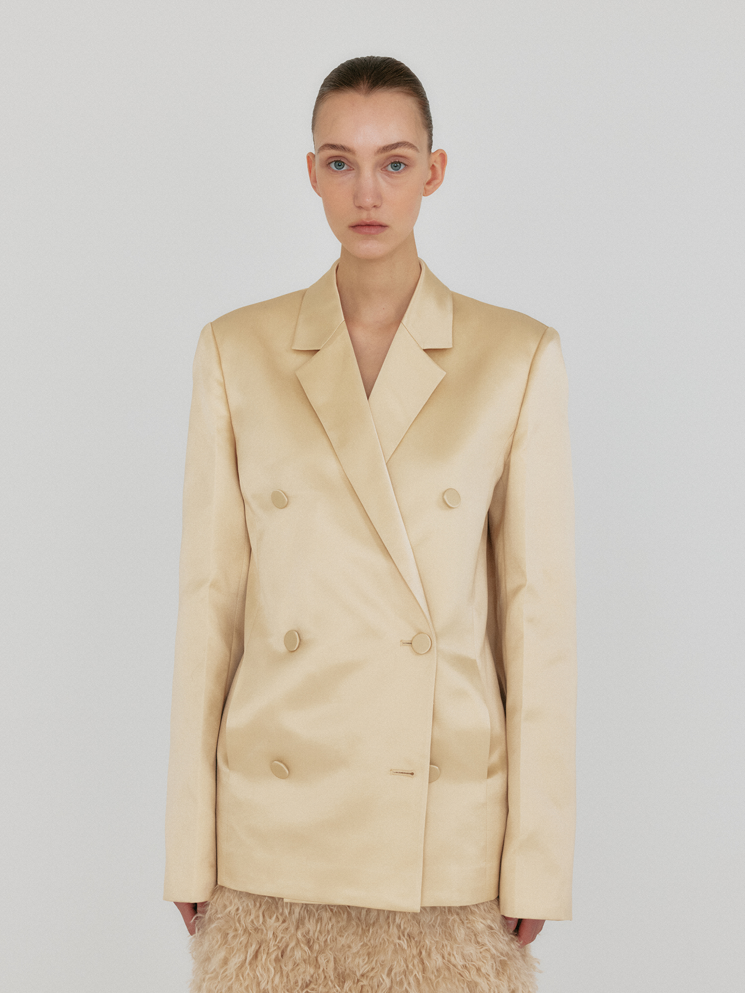 - 실크 혼방 소재의 더블 버튼 자켓